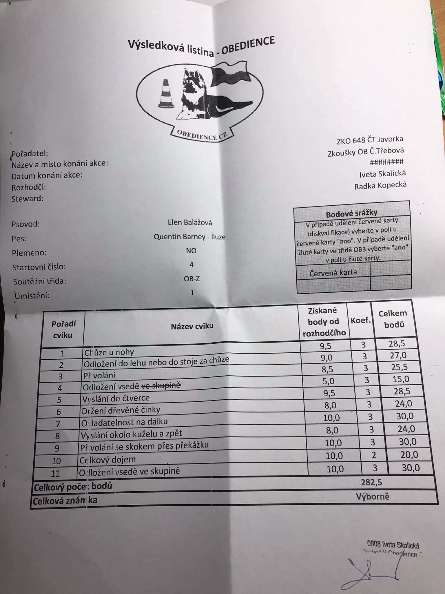 Roční Quentin Barney Iluze (Artuš Scania Hof x Dorothy Iluze) se svojí majitelkou Elen Balážovou zazářili na zkouškách v obedienci a splnili OB-Z na známku výborná. Moc a moc gratuluji