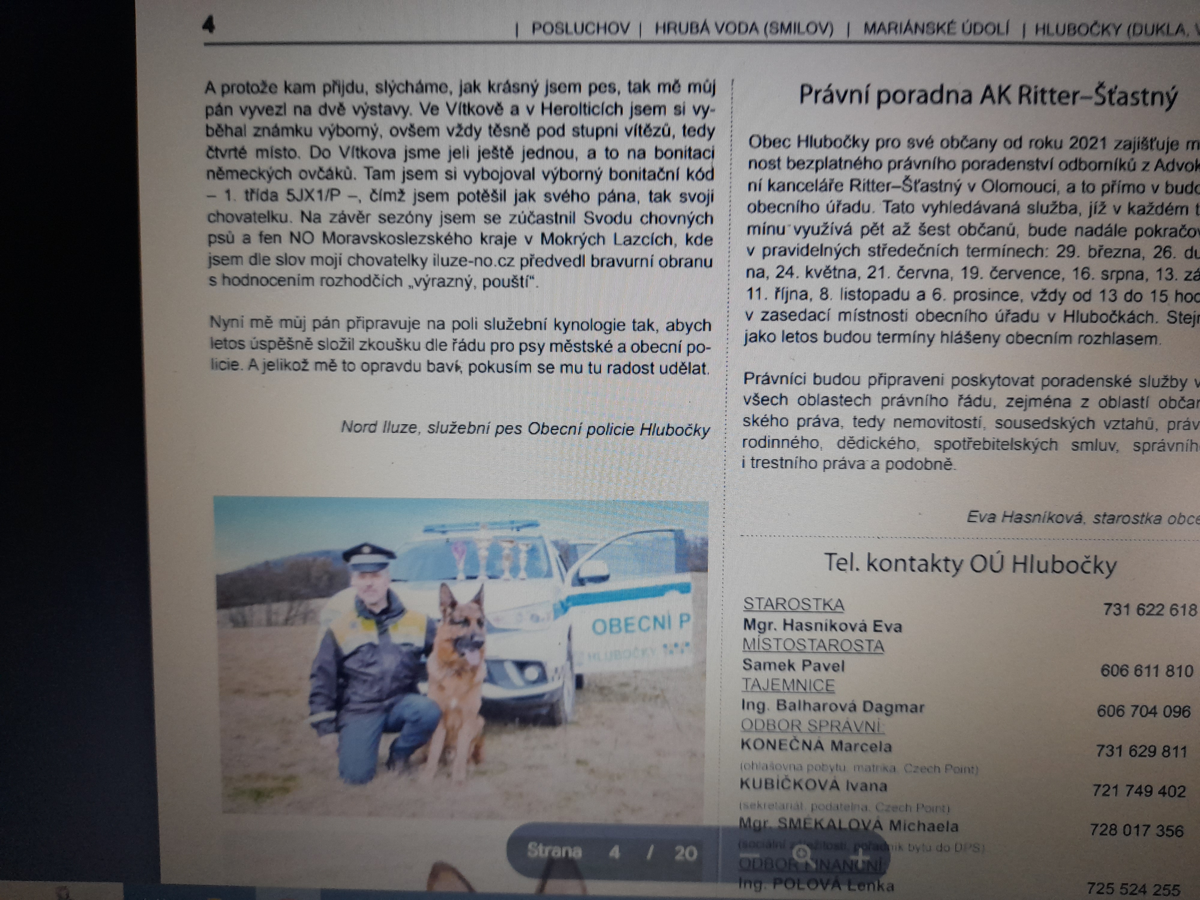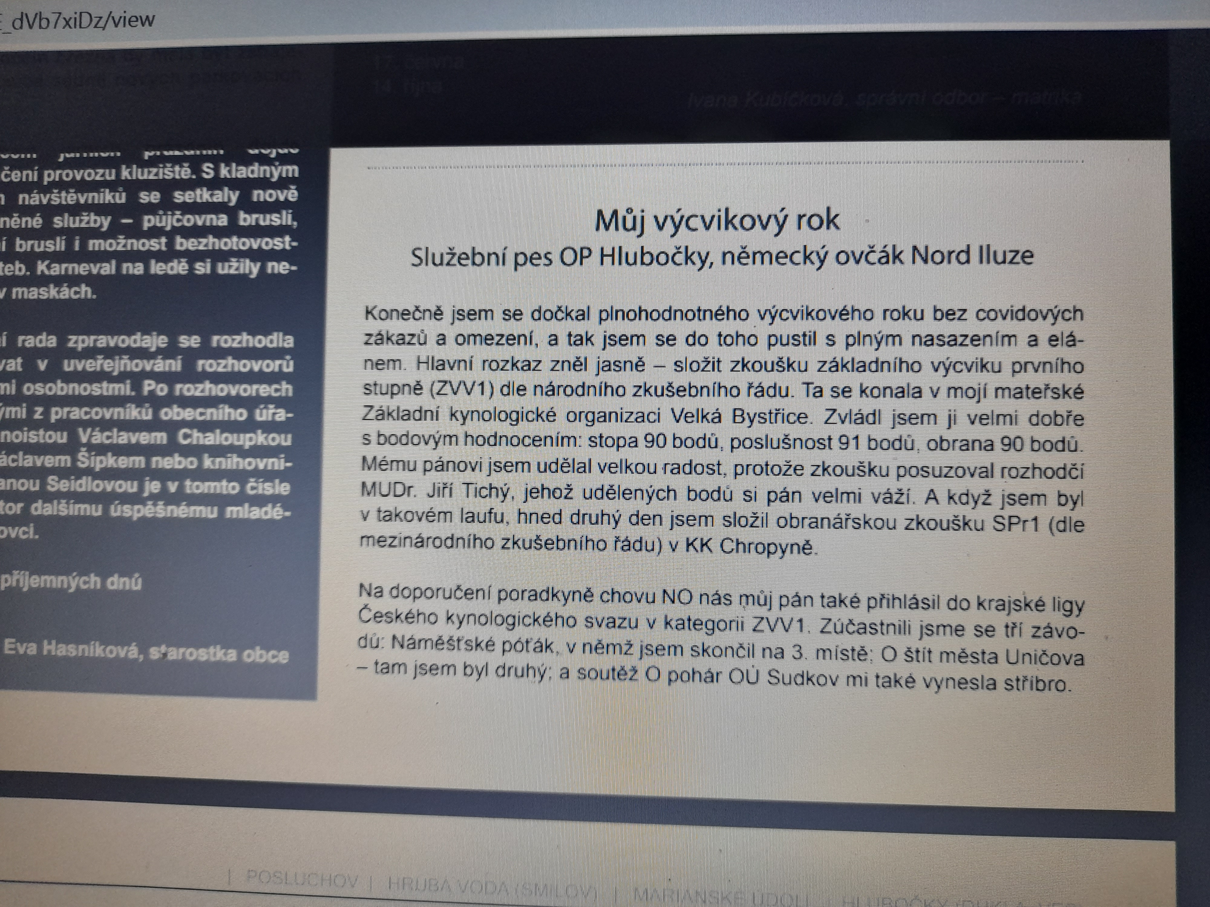 Služební pes Nord Iluze (Klaus v. Tronje x Dorothy Iluze) se se svým psovodem Zdeňkem Osobou stali mediální hvězdou místního zpravodaje v Hlubočkách. Tady je celé povídání o úspěších Norda.