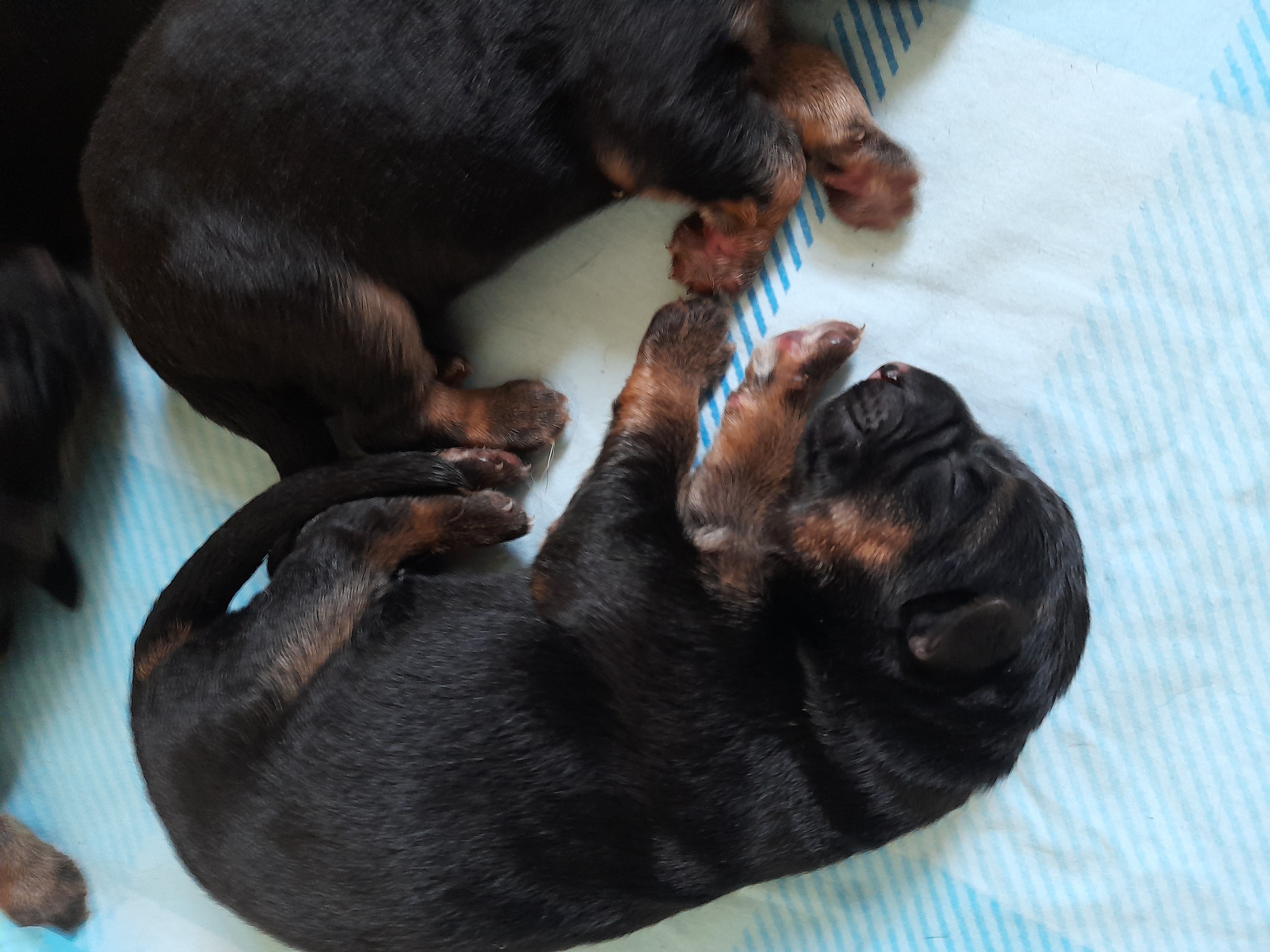 Právě třetí týden. Všichni jsou odčervení, vč. maminy, štěňátka mají zastřihnuty drápky, na plemenné knize je požádáno o zápisová čísla a byla jim přidělena jména 🙂