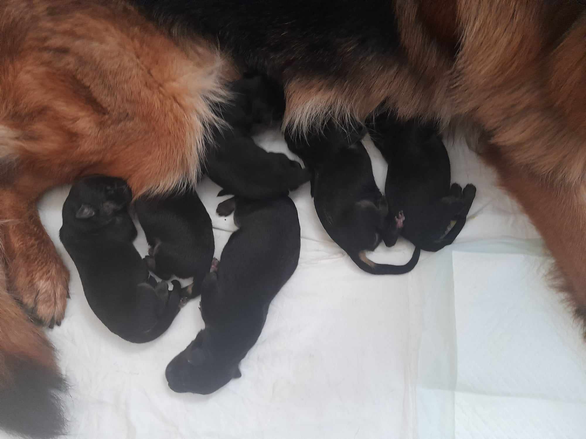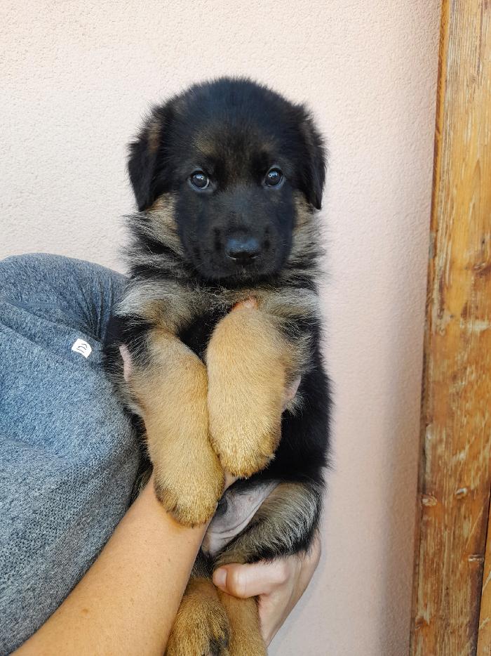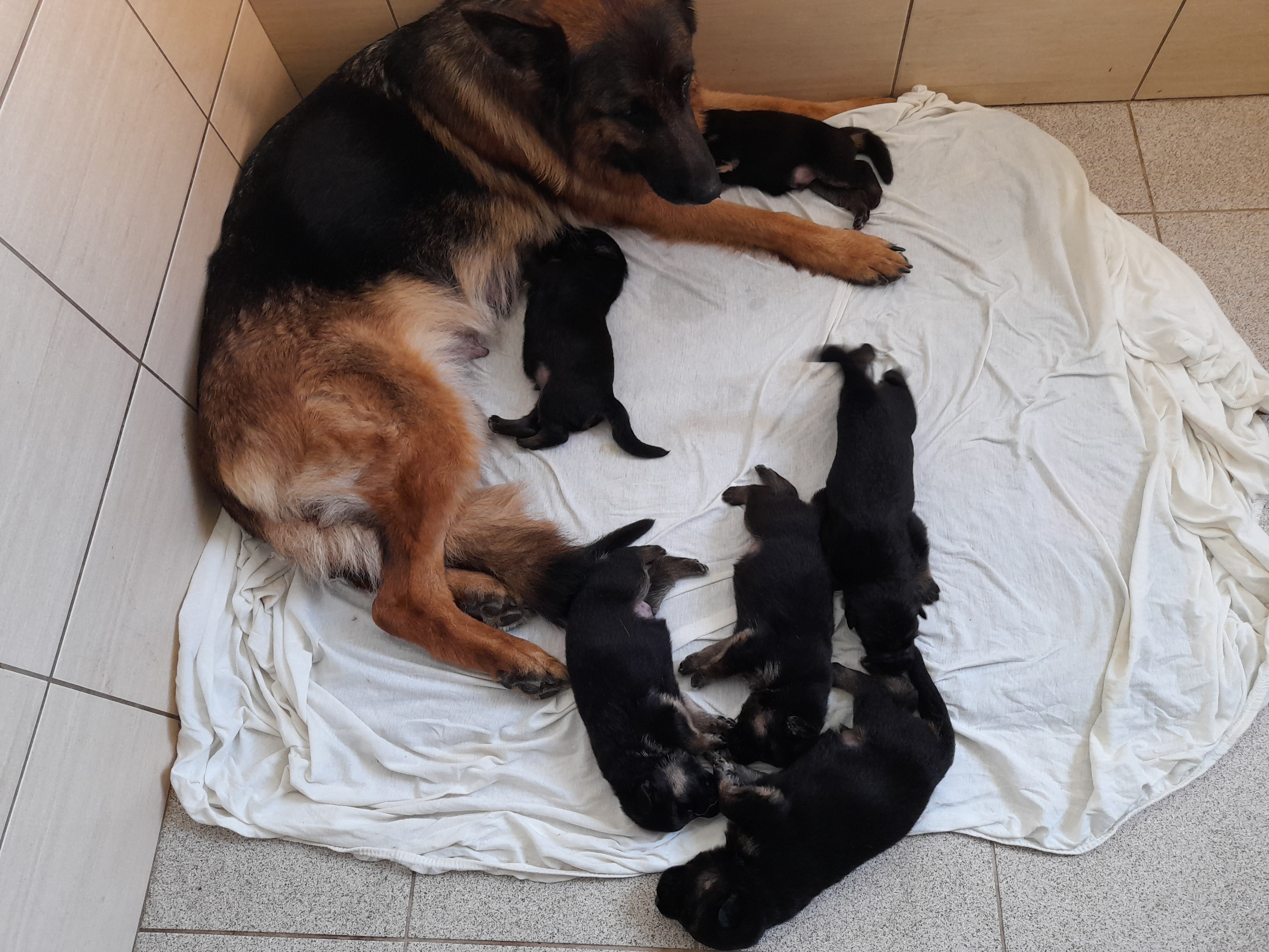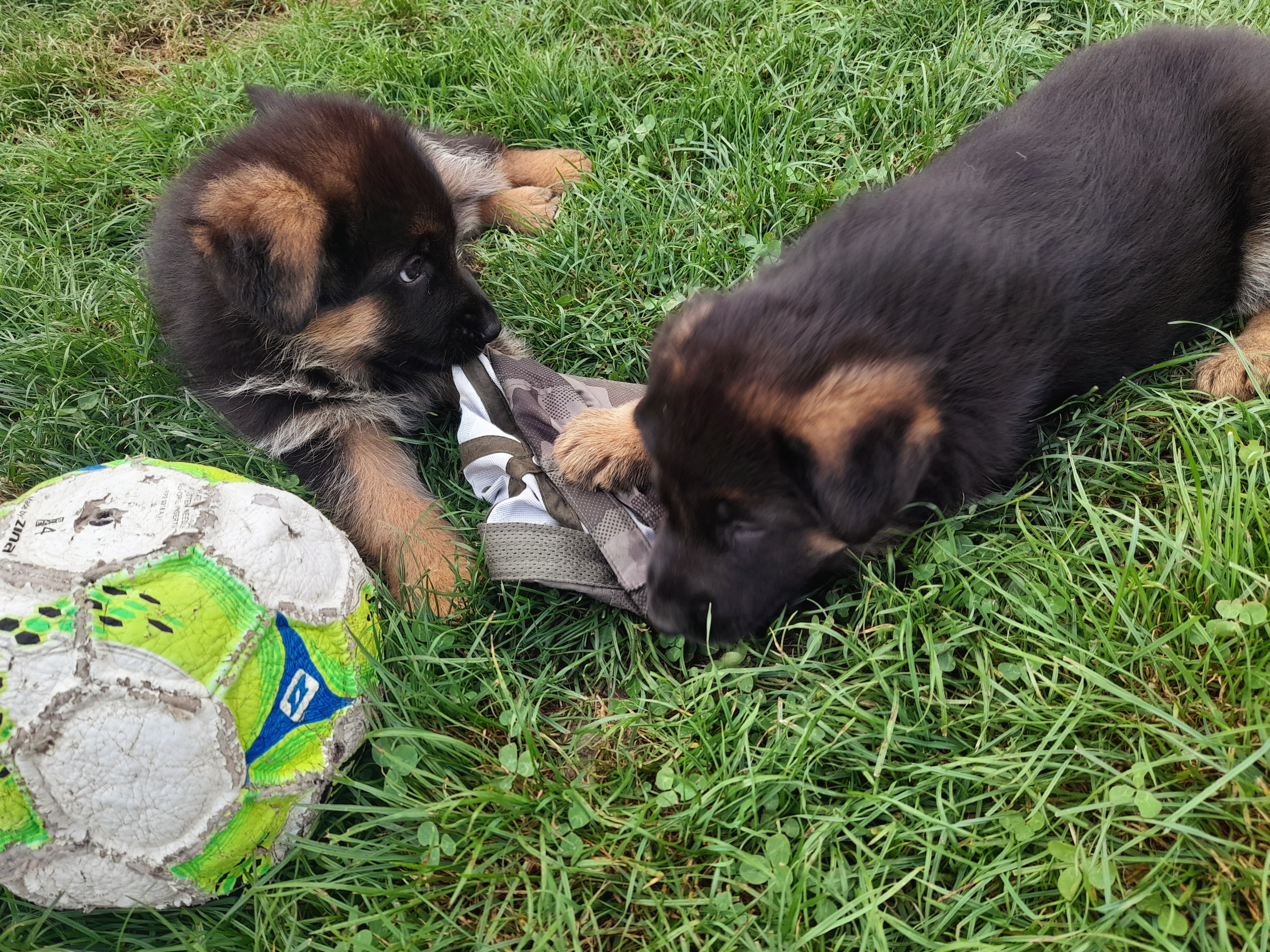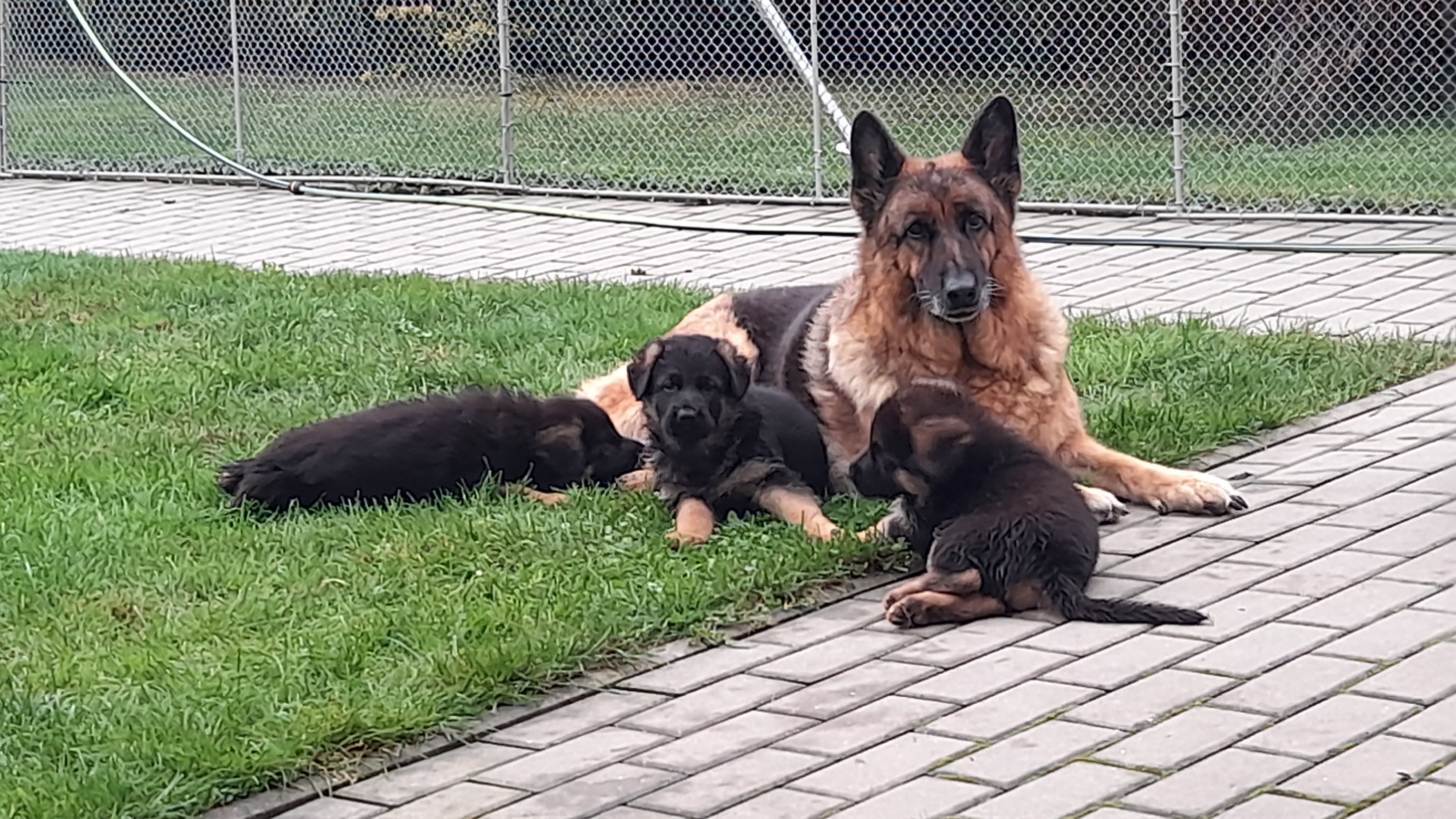 Pět týdnů, rostou z nich nádherní typičtí němečtí ovčáci s velkým potenciálem jak ve výcviku, tak na poli výstavním